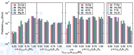 ML was utilized to accelerate the discovery of new solid electrolytes with high ionic conductivity for the application to all-solid-state batteries [,,,,,,,,,]. Fujimura et al. [] reported that a ML model could predict ionic conductivity at 373 K for various compositions in the system , where or As, and or Si, and . The feature variables (descriptors) were the diffusion coefficient at 1600 K calculated by first-principles molecular-dynamics simulations, experimental temperature, the phase transition temperature and the average volume of disordered structures which were obtained by DFT-based calculations []. The ML model employed was the support-vector regression (SVR) method. The predicted ionic conductivities at 373 K for various compositions are shown in Figure 15 []. The predicted ionic conductivities range from about S to about S . However, it can be pointed out that all-dislocation-ceramics [], which could be a new type of solid electrolyte with high ionic conductivity without dendrite formation filled with appropriate dislocations, could not be predicted by ML because ML could not predict beyond the parameter space of the training (experimental and theoretical) data [,,,,,,,,,].
