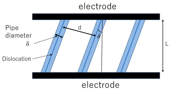 In the following section, how all-dislocation-ceramics was theoretically discovered is discussed [,,]. In the theoretical analysis, parallel straight dislocations in a single-crystal solid electrolyte are considered (Figure 16) []. For each straight dislocation, a dislocation pipe is considered along which ionic conductivity is significantly higher than that in the bulk because the concentration of vacancies is considerably higher [,,,]. The typical diameter of a dislocation pipe is denoted by , and the distance between neighboring dislocations is denoted by which is given by Equation (31) []: