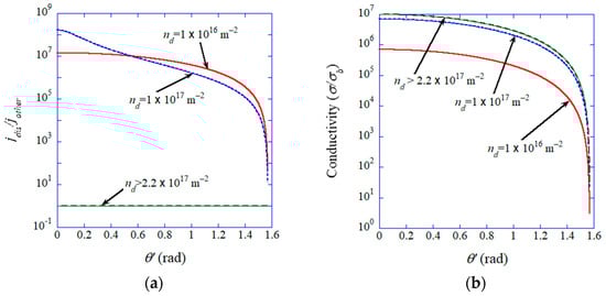 The angle of a straight dislocation relative to the vertical direction to the electrode is denoted by (Figure 16). Then, the mean ionic conductivity () of this system is approximately derived as follows []: