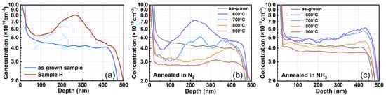 - Sakurai, H.; Narita, T.; Omori, M.; Yamada, S.; Koura, A.; Iwinska, M.; Kataoka, K.; Horita, M.; Ikarashi, N.; Bockowski, M.; et al. Redistribution of Mg and H Atoms in Mg-Implanted GaN through Ultra-High-Pressure Annealing. Appl. Phys. Express 2020, 13, 086501. [Google Scholar] [CrossRef]