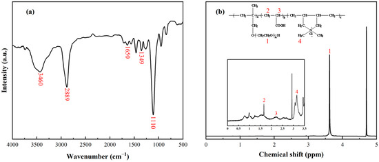 The chemical structure of the APC dispersant was investigated using FTIR and 1H-NMR spectra. In Figure 1a, the broad band at 3460 cm−1 and the sharp peak at 2889 cm−1 originate from the stretching vibration bands of the hydroxyl (-OH) and methyl group (-CH3), respectively. The sharp peak presented at 1110 cm−1 represents the asymmetric stretching vibration of ether groups (-C-O-C) [30]. The peak at 1349 cm−1 corresponds to the -CN stretching vibration of quaternary ammonium groups (–NR3+), and the adsorption band around 1650 cm−1 results from a carbonyl group (-C=O), indicating the presence of both cationic and anionic groups in the APC.