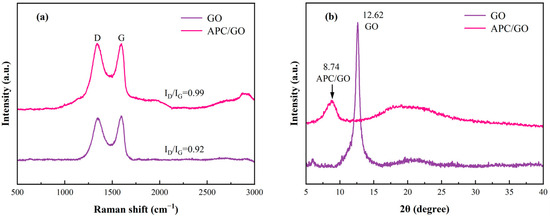 Raman spectra is one of the most effective tools for characterizing carbon-based materials as it is highly sensitive to electronic structures. In Figure 2a, GO presented typical bands at 1344 and 1593 cm−1 which correspond to the D and G bands and are assigned to crystal defects introduced by oxygen functional groups and the in-plane vibration of sp2 carbon atoms, respectively [31]. Generally, the intensity ratio of the D and G bands (ID/IG) expresses the defect density in graphene [32]. After the introduction of the APC, the ID/IG exhibited an increase from 0.92 (GO) to 0.99 (APC/GO), suggesting the presence of amorphous polymers on the GO surface and the successful modification of the APC.