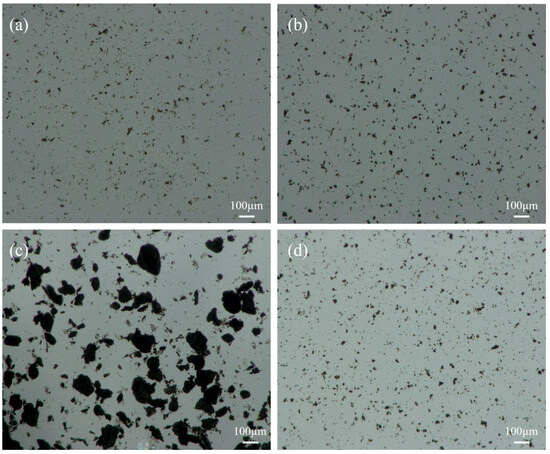Microscopic images were obtained using a super depth of field (SDoF) system to verify the macropores in cement samples cured for 7 days. It was found that there were substantial macropores in the structure of the APC-modified cement cubes in Figure 8a. With the incorporation of defoamers, the number of air voids was reduced to some degree in the APC/D sample presented in Figure 8b due to the defoamer’s effects on the surface properties of the activated air bubbles [27]. As shown in Figure 8c, the addition of the APC/GO composite prevented and removed air voids more efficiently in the cement specimens.