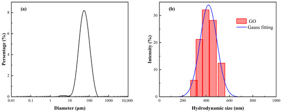 The size distributions of the GO and APC/GO composite in the pore solution were further determined using the laser diffraction method and dynamic laser scattering (DLS) method [37], respectively. As shown in Figure 5a, the median diameter of the GO aggregates in the pore solution was 58.7 µm. To obtain the size distribution of the GO and APC/GO composite, the DLS approach, which has been widely applied to determining the hydrodynamic size of 2D materials, was selected [38,39]. As demonstrated in Figure 5b, the APC/GO aggregates in the pore solution were substantially smaller than the GO aggregates. The average diameter of the APC/GO nanosheets in the pore solution was mainly distributed about 420.3 nm, indicating that the GO can maintain good dispersion in the pore solution after its modification with the APC.