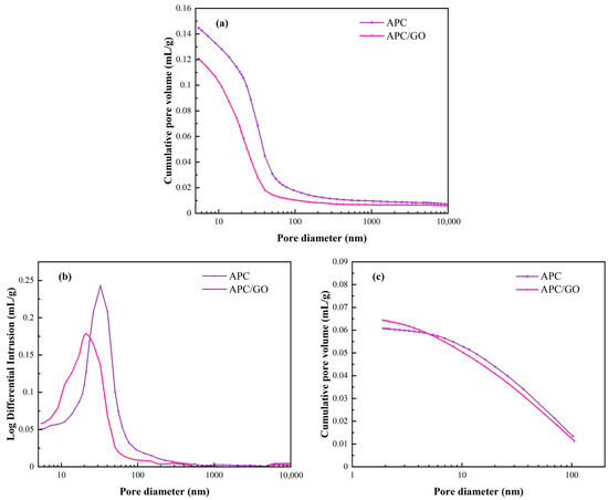 To investigate the pore structure of cement at a microscale, MIP and BET assays were performed to measure micropores in the cement samples [43]. Figure 9a presents the cumulative pore volume curves of the specimens with APC and the APC/GO composite, respectively. A similar decrease in the macropores of the APC/GO sample was observed compared with the APC sample, which corresponds to the defoaming effect of GO on the APC discussed above. In Figure 9b, there was an apparent increase in the segmental porosity (<10 nm) of the APC/GO-modified cement composite, indicating that the incorporation of GO can facilitate the formation of gel pores in the cement matrix [44]. The BET characterization in Figure 9c exhibited similar densification effects of the APC/GO composite on cement. The well-dispersed GO can not only reduce macropores in cement but can also increase the proportion of gel pores originating from the formation of more hydrated products such as calcium silicate hydrate (C-S-H). The refining effect in the microstructure was ascribed to the defoaming effect of well-dispersed GO sheets decreasing the number of unfavorable large pores in the APC/GO cement sample. Another reason could be the abundant oxygen functional groups on the well-dispersed APC/GO sheets that could offer nucleation sites and promote cement hydration, thus contributing to a tighter pore structure [45]. To confirm the nucleation effects of the APC/GO composite, isothermal calorimetry characterization was conducted.