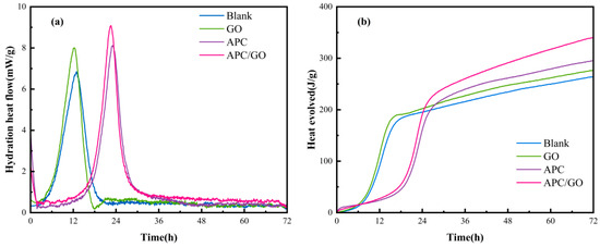 Figure 10 presents the evolution of the heat flow and cumulative heat curves of cement specimens. The introduction of GO accelerated the hydration compared with pure cement, and its cumulative heat for 72 h was 277 J/g, which was only slightly higher than blank specimen (264 J/g). By introducing APC, the induction period of APC/cement specimen was significantly prolonged due to its retardation effect. The retardation effect was resulted from the chelation of Ca2+ with carboxylate groups in APC, which leads to a decrease in the Ca2+ concentration of pore solution and prevents the generation of hydrated products to some extent [46]. Besides, the adsorbed polymer acts as a coating, occupying the nucleation site and restraining ion and water diffusion at the cement and aqueous phase interface [47].