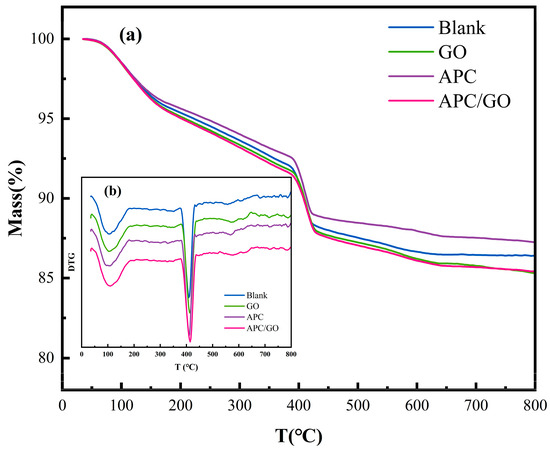 The variation in the XRD curves of the GO and the APC/GO composite was also checked, as illustrated in Figure 2b. The GO exhibited a characteristic sharp peak around 2θ = 12.62°which was attributed to the (001) plane, and its interlayer spacing was 0.70 nm owing to the intercalation of oxygen functional groups in the graphite sheets [33]. Compared with the GO, the APC/GO composite had an obvious left shift and a reduction in the intensity of its diffraction peaks. Meanwhile, the interlayer spacing of the APC/GO composite was correspondingly further increased to 1.01 nm because the adsorption of the APC introduced long side chains to the surface of the GO, resulting in stronger steric hindrance between neighboring GO layers.