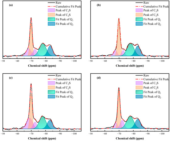 29Si MAS NMR spectra and deconvolution spectra of cement specimens curing at 60 °C. (a) blank sample, (b) GO, (c) APC, and (d) APC/GO.