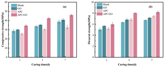 - The flexural strength of the APC/GO sample increased by 21.5% at 7 days compared to a blank sample, mainly because a densified microstructure formed in the APC/GO samples and mechanical interlocking occurred between the GO and hydration products via crosslinking between -COO− and Ca2+.