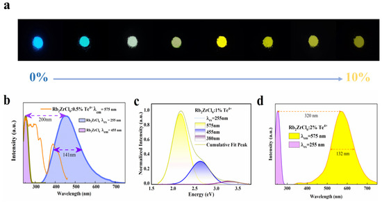 Next, the optical properties of Rb2ZrCl6:xTe4+ were investigated. The ultraviolet fluorescence spectrum of Rb2ZrCl6:xTe4+ showed diverse luminescent characteristics under various excitation wavelengths—bright blue at 254 nm excitation and bright yellow at 365 nm excitation, which resulted in a luminescence wavelength range that could be adjusted within 455 nm to 575 nm, transitioning from blue to yellow, demonstrating excellent spectral tunability. Figure 2 displays the results of optical property testing.