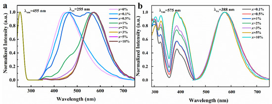 (a) Normalized PLE and PL spectra of Rb2ZrCl6:xTe4+ (λem = 455 nm and λex = 255 nm). (b) Normalized PLE and PL spectra of Rb2ZrCl6:xTe4+ (λem = 575 nm and λex = 388 nm).
