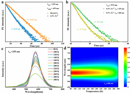 The decay times of Rb2ZrCl6 and Rb2ZrCl6:0.5%Te4+ PL at room temperature are studied, as shown in Figure 4a. The lifetime of Rb2ZrCl6 is about 14.47 μs (λex = 255 nm, λem = 455 nm), and the lifetime of Rb2ZrCl6:0.5%Te4+ is reduced to 8.03 μs (λex = 255 nm, λem = 455 nm) compared to Rb2ZrCl6. This is due to the partial transfer of the exciton of Rb2ZrCl6 to the Te4+ level, which would have led to the reduction of the luminous exciton of Rb2ZrCl6, resulting in faster decay. This also corresponds to the results of excitation and emission spectra as shown in Figure 3a. As shown in Figure 4b, the lifetimes of Rb2ZrCl6:0.5%Te4+ (λex = 255 nm, λem = 575 nm) and Rb2ZrCl6:0.5%Te4+ (λex = 388 nm, λem = 575 nm) are 5.11 μs and 3.75 μs, respectively. This is because under the 388 nm excitation, luminous excitons act directly on Te4+. Under 255 nm excitation, the excitons acting on Te4+ are partly derived from Rb2ZrCl6, so the lifetime is longer.