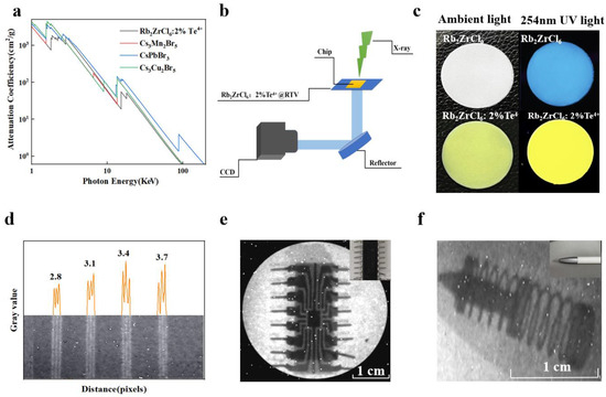 Comparing Rb2ZrCl6, Rb2ZrCl6:2%Te4+, and commercial BGO in terms of XEL, it is observed that Rb2ZrCl6 achieves an optical yield of 89,000 photons/MeV, while Rb2ZrCl6:2%Te4+ reaches 18,000 photons/MeV, which is 11 times and 2.3 times of that of BGO, respectively, as shown in Figure S8. The future applications of Rb2ZrCl6:2%Te4+ and Rb2ZrCl6 in X-ray imaging were investigated. Considering that photodiodes generally peak in their responsiveness within the wavelength range of 500–600 nm [43]. Therefore, the emission light of Rb2ZrCl6 doped with Te4+ can better match the current mainstream CCD. Figure 7a compares the X-ray absorption capacity of Rb2ZrCl6:2%Te4+, Cs3Mn2Br5, CsPbBr3, and Cs3Cu2I5, Rb2ZrCl6:2%Te4+ showed similar X-ray absorption capacity to CsPbBr3. Figure 7b illustrates the X-ray imaging equipment utilized in this study. During the experimental procedures, the settings were configured with a voltage of 100 kV, a current of 1000 μA, and a peak energy of 165 kVp. The Rb2ZrCl6@RTV and Rb2ZrCl6:2%Te4+@RTV composite films with a diameter of 3 cm were prepared using a screen printing method. When observed under natural light, the Rb2ZrCl6 and Rb2ZrCl6:2%Te4+@RTV films appear white and light yellow respectively, and when excited by 254 nm UV light, they show blue and yellow respectively, as shown in Figure 7c. The thickness of Rb2ZrCl6 and Rb2ZrCl6:2%Te4+@RTV films is 70 μm, as shown in Figure S9. As shown in Figure 7d, Rb2ZrCl6:2%Te4+@RTV film as the scintillator screen is used to image the resolution plate, and a resolution of 3.7 lp/mm can be obtained. Its corresponding gray value is shown in Figure 7d. The resolution of Rb2ZrCl6@RTV film is 3.1 lp/mm, as shown in Figure S10. Figure 7e,f show the X-ray image of the chip and the ballpoint pen by using Rb2ZrCl6:2%Te4+@RTV film as the scintillator screen, showing clear internal structure. In the same way, the X-ray imaging test of Rb2ZrCl6@RTV film can also be used for the chip and the ballpoint pen imaging applications, as shown in Figure S11.