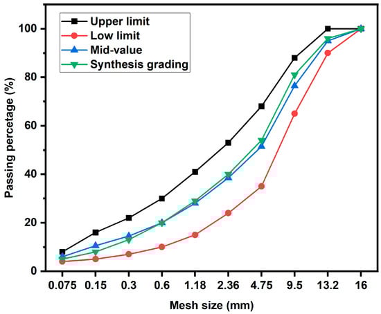 The predetermined asphalt ratio (oil/stone ratio) of the epoxy-modified asphalt mixture was 6.5%. The optimum asphalt ratio in this paper is consistent with the research in literature which adopted an optimum asphalt ratio of 6–7% [,]. The epoxy-modified asphalt binder raw binder was prepared following the method outlined in Section 2.2.1. Subsequently, the epoxy-modified asphalt binder was mixed with aggregate at 140 °C, and immediately put into Marshall molding machine to prepare Marshall specimens, in which the temperature of the mixtures was not strictly controlled. The curing and conditioning steps for the Marshall specimens of epoxy-modified asphalt binder were conducted in alignment with the binder preparation process. The AC-13 aggregate gradation, in which the maximum nominal size is 13 mm, is selected to preparation the epoxy-modified asphalt binder mixture according to the requirements of the standard (Technical Specification for Construction of Highway Asphalt Pavement, JTGF40-2004) in China [], and it is listed in Figure 2.