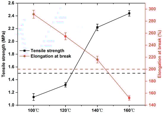 The preparation and curing temperature of epoxy-modified asphalt binder has a large impact on the performance of modified asphalt binder. Thus, the reserve time of the modified asphalt binder met the requirements, and a tensile test was used to further investigate the effect of preparation temperature on the mechanical properties of the unaged epoxy-modified asphalt binder. According to the standard (GB/T 30598-2014 and ASTM D7369), the tensile strength and elongation at break of epoxy-modified asphalt binder should be greater than 200% and 1.5 MPa, respectively. As Figure 4 shows, with the increase in preparation temperature, the higher the tensile strength of the epoxy-modified asphalt binder material are, the lower the elongation at break of the epoxy-modified asphalt binder material are. This is because as the mixing temperature increases, the curing reaction in 2 h (120 min) is more adequate, and the base of strength growth in the post-conditioning process is increased so that a higher post-strength will be obtained. Meanwhile, Figure 4 shows that only at 140 °C, the tensile strength and elongation can meet the requirement that the tensile strength and elongation at break of modified bitumen should be greater than 200% and 1.5 MPa, respectively.