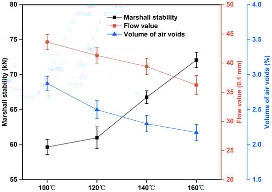 The Marshall stability test was utilized to assess the rutting resistance of asphalt mixtures. The Marshall stability (MS) and flow value (FV) were the peak load and corresponding vertical deformation in the Marshall test, respectively. Figure 5 exhibits that different preparation temperatures have a significant impact on the mechanic strength of epoxy-modified asphalt mixtures, in which the higher the preparation temperature, the greater the MS of the corresponding epoxy asphalt mixtures and the smaller the FV of epoxy-modified asphalt mixtures. The results of the Marshall stability test on epoxy-modified asphalt binder are consistent with the changing law of tensile strength and elongation at break of epoxy-modified asphalt binder. In addition, the MS values and FL values of all epoxy-modified asphalt mixtures under the four preparation temperatures can meet the requirements of the corresponding indexes in the standard of GB/T 30598-2014 and ASTM D6927, in which the Marshall stability is greater than 40 kN, and the flow value is between 20–50. As we know, the higher the preparation temperature of modified asphalt binder, the more its production cost will also increase, but the preparation temperature is lower than 120 °C, which will also enhance the mixing plant temperature control difficulties. The above tests show that the epoxy-modified asphalt binder prepared at 140 °C can fully meet the performance requirements of epoxy-modified asphalt binder for road engineering in terms of reserve time and mechanical properties.