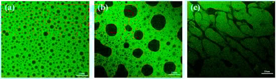 The aging of epoxy-modified asphalt binder is mainly due to the ageing of the basic asphalt binder [,]. To investigate the effect of the ageing basic asphalt binder on epoxy modified asphalt binder, the micro-morphological state of the epoxy resin in epoxy-modified asphalt binder was observed using a laser confocal microscope with an excitation wavelength of 488 nm. As shown in Figure 6, the absence of fluorescent substances within the asphalt binder does not emit excitation light and is shown as a black image, while the epoxy resin is irradiated by the laser to emit excitation light and is shown as a green image. Figure 6 shows that the green area, which represents the epoxy resin, has a much larger area than the black area representing the asphalt binder. This suggests that the epoxy resin and asphalt binder have formed a spatial three-dimensional mesh structure. As shown in Figure 6a, the asphalt binder exhibits black dots in a uniform distribution of the epoxy system after short-term aging, which indicates that the new epoxy-modified asphalt binder has great compatibility and colloidal stability. After long-term aging, the basic asphalt binder aggregates into a black island structure distributed in the epoxy resin phase, and the area and size of the black area increase significantly. After ultra-long-term aging, the phenomenon of basic asphalt binder aggregation becomes more pronounced, forming a structure like a neural network with connected island-like protruding vesicles. It appears that the compatibility between the asphalt binder and the epoxy resin deteriorates as the asphalt binder ages.
