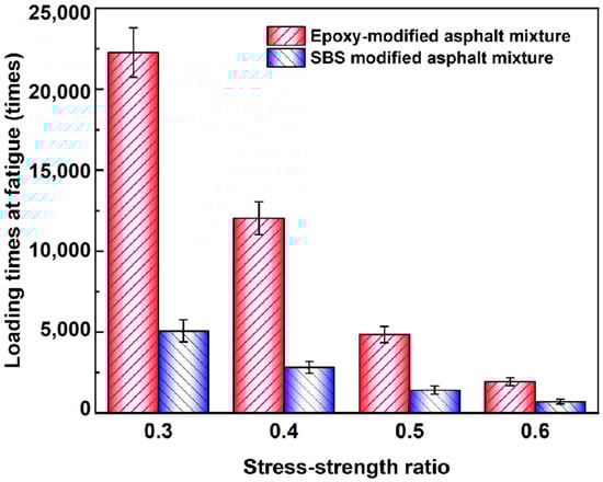The fatigue life of epoxy-modified asphalt and SBS-modified asphalt mixture under different stress–strength ratios.