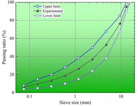 The experiment adopts AH-70# and AH-90# petroleum asphalt from Sinopec Oilu Petrochemical Company (Beijing, China) with penetration grades of 70 and 90 to prepare the mixtures. Its essential characteristics are detailed in Table 1. Basalt aggregates, along with their apparent gravity and moisture uptake ratio, are outlined in Table 2. The experiment adopts the AC-13 gradation recommended by China’s technical specification JTG D50-2017 [29] for the dense mixture depicted in Figure 1. Based on Marshall test outcomes, the optimal asphalt content is determined to be 4.8%, resulting in a mixture apparent gravity of 2.457 g/cm3 and an air void of 3.8%.