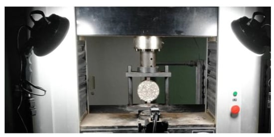This work selects the indirect tensile relaxation test to measure the viscoelastic parameters of asphalt mixture [36]. Due to the limitation of loading rate, the initial constant strain cannot be applied instantaneously, and a loading time is required. In the early loading stage, the loading rate of 1 mm/min is adopted to make the indirect tensile strain reach the set value according to the Chinese specification JTG E20-2011 [37]. The specimen dimension is 101.6 × 63.5 mm. In order to ensure that the asphalt mixture is relaxing completely in the linear viscoelastic stage, 30% of the ultimate tensile strain is taken as the set value in this work. The digital image correlation (DIC) is used to measure the strain field of asphalt mixture. The specimen surface is polished to obtain the characteristic of random speckle [38]. The process of indirect tensile relaxation test is shown in Figure 2, and the experiment is conducted at 20 °C due to the limitation of equipment.