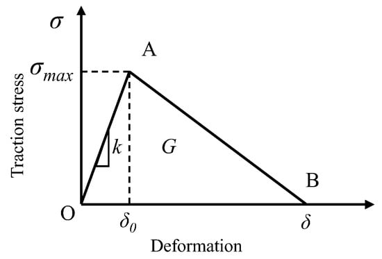 Cohesive zone model (CZM) has been widely used to investigate the interface debonding process in material fracture evaluation. Therefore, the bilinear cohesive zone model was selected to describe the constitutive relation of bonding interface. Tractor-separation law is shown in Figure 4.