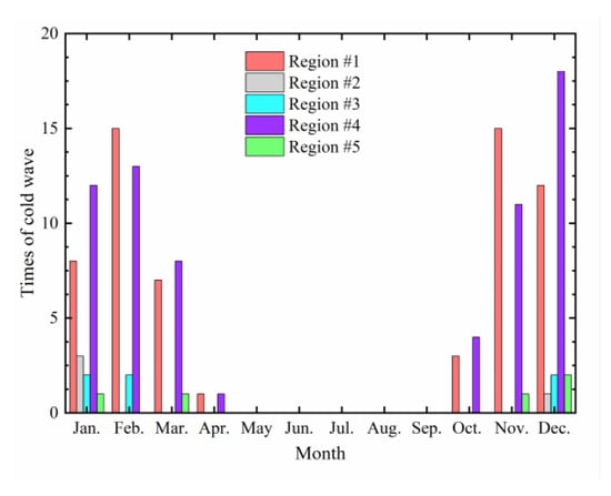 As shown in Figure 5, the occurrence of cold waves in various regions is concentrated in January to March and October to December, which are roughly the winter months in the northern hemisphere. Only a few cold waves occur in spring, and none occur in summer. Regions #1 and #4 experience many instances of cold waves, corresponding to North China and Northeast China, respectively. According to the distribution trend, the months with the highest frequency of cold waves in region #1 are November and February, with similar occurrences in both months. For region #4, the month with the most cases of cold waves is December, followed by February. This indicates that the frequency and timing of cold waves vary across different regions. Based on their geographical locations, Northeast China has a higher latitude than North China, suggesting that the higher the latitude, the greater the probability of cold waves occurring in December. On the other hand, cold waves in regions #2, #3, and # 5 mainly occur from November of the previous year to February of the next year, with a maximum of three occurrences in January. This further demonstrates that the timing of cold waves varies significantly across regions, and there are also obvious differences in the frequency of cold waves (e.g., in December, region #4 experienced 18 cold waves from 2012 to 2019, while region #2 only experienced one). This implies that the change in atmospheric temperature would impose a notable impact on asphalt pavement, and this impact on the thermal fatigue life of asphalt pavement deserves further attention.