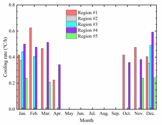 The maximum cooling rate corresponding to cold waves In each month was taken as the representative value of the cooling rate. The distribution of the cooling rate is shown in Figure 6.