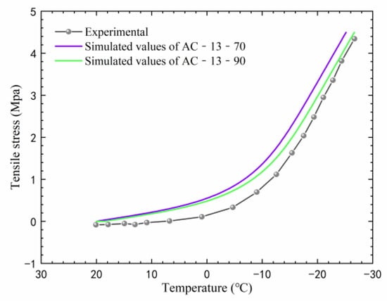 As can be seen from Figure 7, the thermal stress simulated using the finite element method is higher than the measured one. Although the curves do not completely overlap, their trends of variation with the decrease in temperature are consistent. The final failure stress is essentially consistent with the measured value. This indicates that the thermal stress of the asphalt mixture can be predicted by the finite element method. Figure 7 also shows that the thermal stress increases as the temperature decreases. After the temperature drops below −10 °C, the growth rate of thermal stress begins to accelerate significantly. This means that when the temperature is above −10 °C, asphalt concrete has good relaxation performance, which reduces the thermal stress. However, as the temperature decreases, the asphalt binder gradually becomes harder, reducing its ability to relax thermal stress, which results in a gradual accumulation of thermal stress. Wang et al. [10] indicated that when the temperature drops below −18.6 °C, the thermal stress increases linearly. This is consistent with the findings of this study, where at this point, the thermal stress cannot be relaxed at all, and it increases linearly.