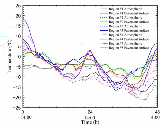 where T0 represents the road surface temperature; Ta1 represents the atmospheric temperature of the previous 1 h; and Q4 is the cumulative solar radiation intensity of the previous 4 h (kW/m2). In this paper, this relationship is used to determine the road surface temperature based on atmospheric temperature, and the road surface temperature is used for the thermal boundary in FE simulation. The variations of road surface temperature for the typical 48 h cold waves are shown in Figure 8.