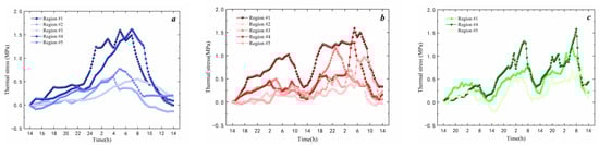 As shown in Figure 8, the road surface temperature is not consistent with the atmospheric temperature in all regions. In region #1, the road surface temperature gradually rises after 8:00 a.m., and the highest difference between the road surface temperature and the air temperature is 14 °C. After 18:00, the trend of road surface temperature gradually becomes consistent with that of the air temperature, but the road surface temperature is still about 2.5 °C higher than the air temperature. Although the changes in road surface temperature in the other four regions are similar to that of region #1, the differences between road surface temperature and air temperature are not as large as in region #1. For example, in region #3, the highest difference between road surface temperature and air temperature is only 6.4 °C. This is because the weather conditions in different regions affect the cloud coverage and solar radiation, resulting in road surface temperature approaching atmospheric temperature. However, in northern China, cold waves are often accompanied by windy weather, and most of the time, after the temperature drop, it is sunny. At this time, the road surface is exposed to good solar radiation, ultimately leading to a significant increase in road surface temperature. Overall, road surface temperature is not consistent with atmospheric temperature, and when evaluating the thermal stress, it is necessary to adopt the road surface temperature as a thermal boundary for simulation. Xu et al. [45] pointed out that low-temperature cyclic action will lead to an increase in the micro-defects of asphalt mastic, and the bee structures of asphalt mastic are replaced by irregular valley formations. After the cycling action, the relaxation performance of the asphalt mastic decreases, and the bonding performance at the asphalt–aggregate interface deteriorates. Thermal stresses under the influence of extreme cold waves in each region are shown in Figure 9.