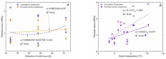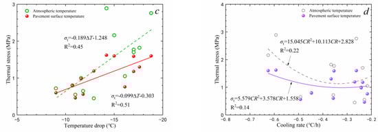 As can be seen from Figure 10a, there is no correlation between the duration of the cold wave and thermal stress, indicating that the duration of the cold wave does not have a significant impact on the peak thermal stress. Figure 10b,c show that there is a moderate correlation between thermal stress and both the initial temperature and the cooling rate. The lower the initial temperature and the greater the cooling rate, the higher the thermal stress generated later. Figure 10d indicates that there is a weak correlation between the peak thermal stress and the cooling rate. Higher cooling rates lead to higher peak thermal stress. When the cooling rate is lower than −0.5 °C/h, the peak thermal stress increases rapidly. It can be inferred that the magnitude of thermal stress in asphalt pavements is primarily influenced by the temperature drop and the road surface temperature at the onset of the cold wave.