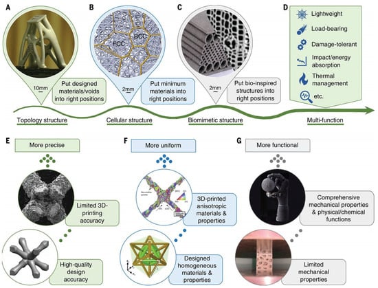 Multifunctional LPBF additive manufacturing through structural design and innovation to reflect the idea of “unique structures printed for unique functions” [20]. (A) A topology-optimized satellite bracket filled with lattices, (B) a crystal-inspired cellular structure containing hierarchical face-centered cubic (FCC) and (C) body-centered cubic (BCC) lattices, and (D) a functional graded sandwich structure inspired by the Norway spruce stem. Three categories of existing gaps and development directions in multifunctional laser-metal AM, in terms of (E) manufacturing accuracy, (F) material and property anisotropy, and (G) diversity of functions.