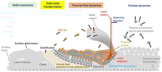 A schematic illustration of multi-scale, multi-physics phenomena in LPBF [57].