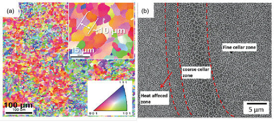 (a) Inverse polar figure obtained by EBSD; (b) LPBFed AlSi alloy microstructure at high magnification [78].