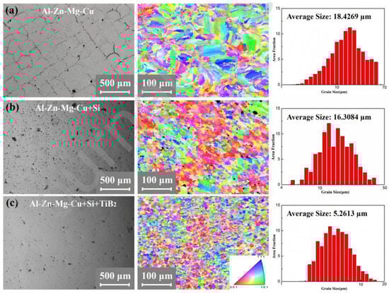 OM images, EBSD images, and grain size distributions of [90]: (a) the as-printed Al-Zn-Mg-Cu alloy; (b) the Al-Zn-Mg-Cu + Si alloy, and (c) the Al-Zn-Mg-Cu + Si + TiB2 alloy.