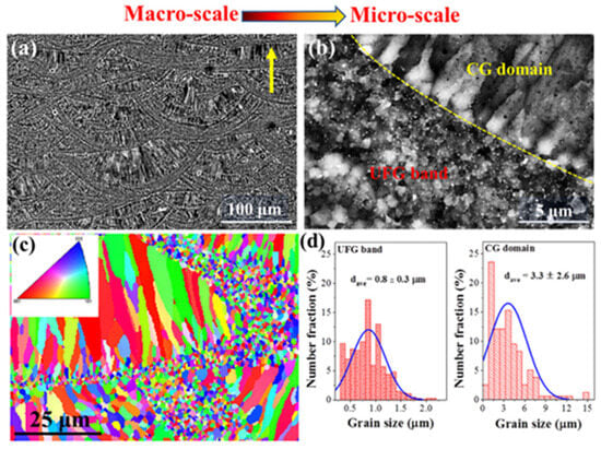 Microstructure of AlMgScZr alloy [101]. (a,b) SEM images showing the heterogeneous microstructure in the SLM-processed AlMgScZr alloy; (c) EBSD maps showing the heterogeneous α-Al grain structure; (d) grain size distributions in the UFG bands and CG domains.