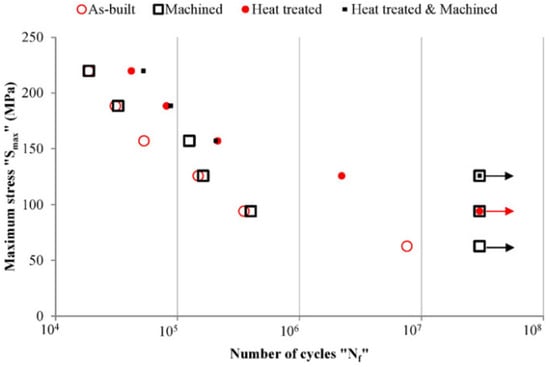In addition, some scholars have also studied the fatigue properties of aluminum alloys prepared by LPBF technology [104,105]. Studies have shown that the fatigue properties of the AlSi10Mg alloy prepared by LPBF technology are similar to those of the casting A360 alloy [106], and its fatigue strength can reach 120 MPa [107]. The key factors affecting the fatigue properties of LPBF aluminum alloys include porosity, microstructure, residual stress, and surface roughness. By adopting suitable process parameters, the density of AlSi10Mg alloy can reach 99.8% [106]. By the hot isostatic pressing process, almost completely dense aluminum-alloy-formed parts can be produced [108]. Some scholars have also explored the impact of heat treatment and surface processing on the fatigue properties of AlSi10Mg, as shown in Figure 7 [109]. The study found that although surface processing can improve the high-cycle fatigue properties of aluminum alloys, it has little effect on their low-cycle fatigue properties. Heat treatment can significantly improve the fatigue properties of aluminum alloys, which is mainly due to the improvement of elongation rate, microstructure transformation, and reduction in residual stress. In addition, the orientation angle of the formed parts also has an impact on their fatigue properties. When the angle is 0°, the fatigue performance of the part is the best [110,111], and this difference can be eliminated by heat treatment and bottom plate heating [106].