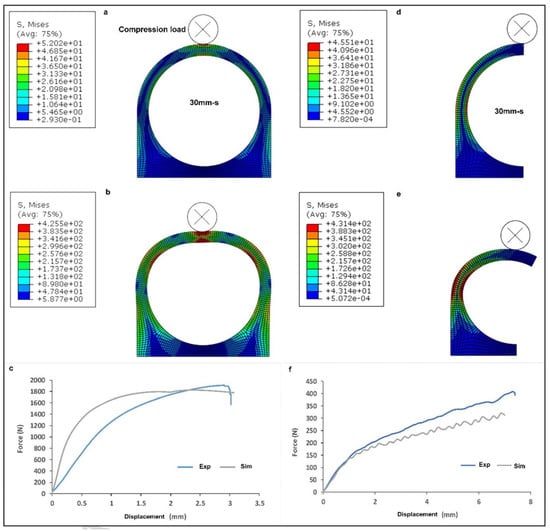 The simulated compressive behavior of 30 mm overhang WPS structures: (a–c) full-circle overhang; (d–f) half-circle overhang [122].