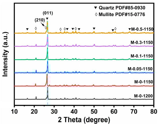 Figure 1 shows the XRD patterns for the six ceramic samples prepared at different conditions. The main crystalline phases of the six samples are mullite (PDF# 15-0776) and quartz (PDF# 85-0930). The diffraction peaks located at 26.3°and 26.6°are attributed to the (210) facet of mullite phase and (011) facet of quartz phase, respectively. No diffraction peaks attributed to MnO2 were observed, probably due to the tiny amount of MnO2. Meanwhile, compared to the other five samples, the diffraction peak of M-0-1150 located at 26.6° slightly shifted to the direction of the low degree by 0.3°, indicating that the cell parameters had become larger. As no obvious difference in the diffraction peak positions between the undoped ceramic sample sintered at 1200 °C and the MnO2-doped counterparts sintered at 1150 °C was observed, we speculated that the added MnO2 effectively suppressed the abnormal growth of grains and the resulting formation of a large number of pores caused by a lower sintering temperature.