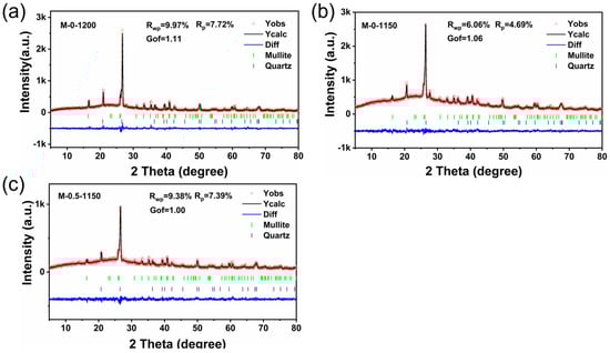 Rietveld refinement of the XRD patterns for (a) M-0-1200, (b) M-0-1150, and (c) M-0.5-1150.