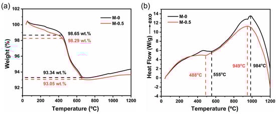 The TGA and DSC analysis of the M-0 and M-0.5 samples were performed and the results are shown in Figure 3. In Figure 3a, weight loss occurred in the in the M-0.5 sample in the temperature range of 30–500 °C. The moisture residue in the ceramic body was converted to water vapor and removed rapidly, possibly accompanied by the elimination of some impurities, in a thermal environment. For the DSC curves in Figure 3b, an endothermic peak appeared at ~488 °C for the M-0.5 sample, while the endothermic peak for the M-0 sample appeared at ~550 °C. The emergence of the endothermic peak probably resulted from the removal of the crystal water in the ceramic body. The shift of the endothermic peak to the direction of a low temperature suggested that the MnO2 doping facilitated the removal of crystal water in the sintering of the aluminosilicate ceramic body. Moreover, owing to the crystallization process, an exothermic peak for the M-0.5 sample appeared at ~949 °C, lower by 35 °C than that of the M-0 sample, which suggested that the MnO2 in the ceramic body made the crystallization start to occur at a lower temperature. Based on these results, we deduced that enough MnO2 additive promoted the rapid elimination of moisture residue and crystal water in the ceramic body sintered at a lower temperature and thus reduced the total pore amount and volume. It suppressed the abnormal growth of grains during the sintering process and improved the densification of ceramics [32].