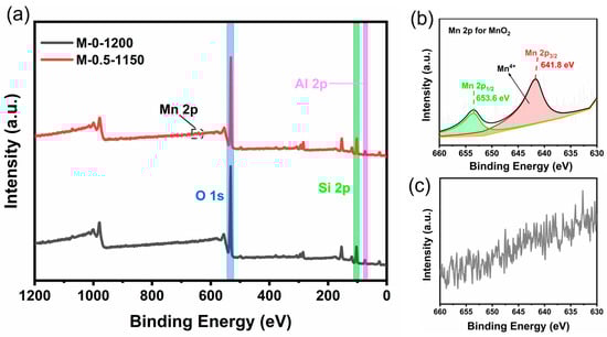 Because of the detection limit of XRD and the low amount of addition (<0.5 wt.%), the MnO2 phase that possibly exists in the ceramic sample may not be detected. Thereby, X-ray photoelectron spectroscopy (XPS) was used to analyze the valence state of the Mn element in the prepared sample to determine the existing form of Mn; the results are shown in Figure 4. Figure 4a presents the Si2p, Al2p, and O1s signals in the M-0-1200 and M-0.5-1150 samples. No signal belonging to the Mn element was observed for the M-0-1200 sample (Figure 4c), while two peaks located at 653.6 eV and 641.8 eV, ascribed to Mn (IV) 2p1/2 and 2p3/2, were observed for the Mn-0.5-1150 sample (Figure 4b). This result indicates the existence of MnO2.
