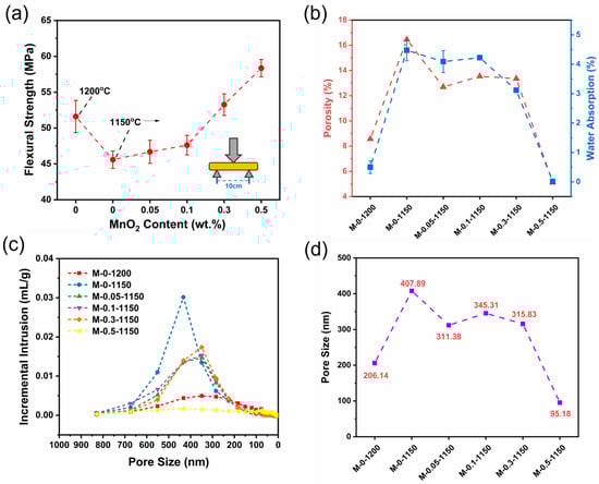 For the impact of the MnO2 addition, the flexural strength and water absorption of the ceramic samples were characterized by a three-point bending test and mercury intrusion porosimetry, respectively. Figure 5a shows that without MnO2 addition, the flexural strength of sample decreased by 11.65%, from 51.61 MPa to 45.59 MPa, upon the reduction in the sintering temperature from 1200 °C to 1150 °C. After MnO2 doping and sintering at 1150 °C, the flexural strength of the sample was enhanced gradually with the increase in the MnO2 doping amount. The 0.3 wt.% of MnO2 addition enabled the flexural strength of M-0.3-1150 to reach 53.27 MPa, exceeding that of M-0-1200. Further increasing the MnO2 content to 0.5 wt.% endowed the M-0.5-1150 sample with a flexural strength of 58.36 MPa, higher than that of M-0-1200 by 13.08%. The experimental data show that the flexural strength of MnO2 sintered at 1150 °C with an addition of 0.5 wt.% exceeds that of the undoped sample sintered at 1200 °C. Based on these results, we speculated that the MnO2 doping made the ceramic sample become more densified and possess more grain boundaries, and the latter largely avoided the excessive growth of cracks, absorbed more energy, and acted as a buffer against cracks. MnO2 is beneficial to stop the abnormal growth of grains caused by lower sintering temperatures [33].