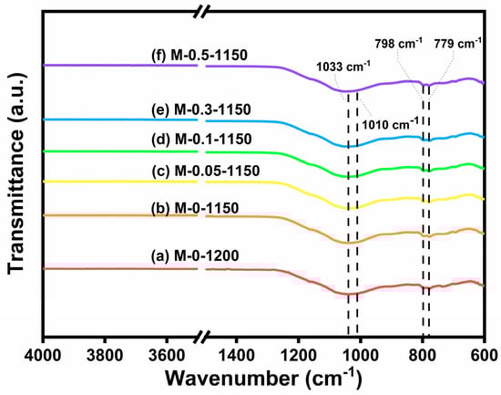 As a conventional structural characterization method, FTIR spectroscopy can identify the functional groups and vibration modes in materials. In silicate crystals, the composition contains a variety of other cations in addition to silicon and oxygen, which may result in the occurrence of an isomorphous replacement. Thus, FTIR characterization was conducted to figure out whether manganese ions replaced aluminum ions in the aluminosilicate crystals after the addition of MnO2 [35]. Figure 6 shows the FTIR spectra of the six sintered ceramic samples. The peaks appearing at 779 and 798 cm−1 are from the quartz phase [36]. And the absorption band at 1033 and 1010 cm−1 arise from the vibrations of Si-O-Si and Si-O-Al, respectively [14]. No noticeable peak that arose from the MnO2 doping appeared, indicating that 0–0.5 wt.% MnO2 doping did not lead to manganese ion replacement during crystallization.