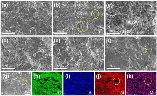 (a–f) SEM images of M-0-1200,M-0-1150, M-0.05-1150, M-0.1-1150, M-0.3-1150 and M-0.5-1150. (g) Field emission SEM images of M-0.5-1150 and element mapping results of (h) O, (i) Si, (j) Al, (k) Mn signals. The pores are marked by yellow circle.