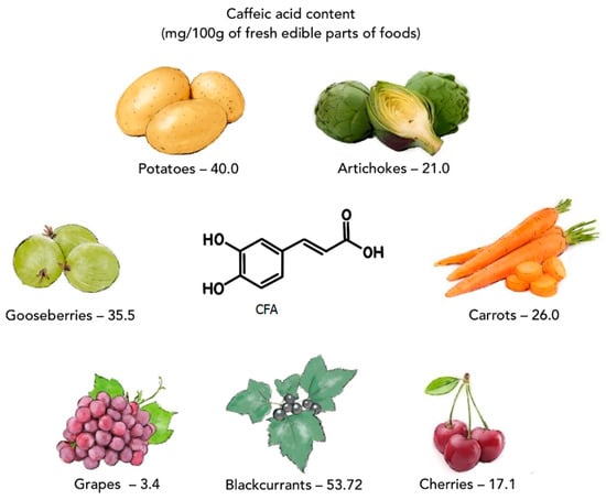 Caffeic acid (CFA) is a natural phenolic compound (a secondary metabolite of plants), belonging to the family of hydroxycinnamic acids (HCAs). CFA is biosynthesized in plant tissues via the endogenous shikimate pathway, which is known to be responsible for the production of aromatic amino acids from glucose []. Phenylalanine is a precursor for the synthesis of CFA []. CFA can be found in many products consumed daily, such as coffee beans, green tea, tomatoes [], potatoes [], artichokes, carrots, lettuces, dark plums, cherries, gooseberries, blackcurrants, grapes [], and herbs (basil, rosemary, oregano) (Figure 1) [,]. CFA and other phenolic compounds are involved in plants’ defense mechanism against insects, pathogens, animals (biotic stresses), and environmental conditions, such as excess water, drought, low and high temperatures, salinity, heavy metals, and ultraviolet radiation (abiotic stresses) [,]. Numerous in vitro and in vivo studies have shown that CFA has many biological properties, including anti-inflammatory [,,], anticancer [,,,], antibacterial [,,], antiviral [,], antidiabetic [,], hepatoprotective [,,], and cardioprotective activity [,]. The presence of a catechol group with a chain of α,β-unsaturated carboxylic acids in the chemical structure of CFA affects its antioxidant properties. This antioxidant mechanism of action is based on the generation of an o-chinone group after the electron donation. Conjugation of the catechol group with the double side binding of o-quinone causes electron delocalization, increasing the stability of the o-quinone radical and the antiradical activity of CFA []. CFA can also form complexes with metals (e.g., with iron or copper), inhibiting the decomposition of peroxides, which limits the formation of free radicals and their negative impact on the organism. The excess of free radicals in the organism contributes to unfavorable changes/damage in the structure of proteins, lipids, carbohydrates, and DNA and triggers a number of diseases (e.g., atherosclerosis, asthma, cancer, diabetes, Alzheimer’s, and Parkinson’s diseases) [,,].