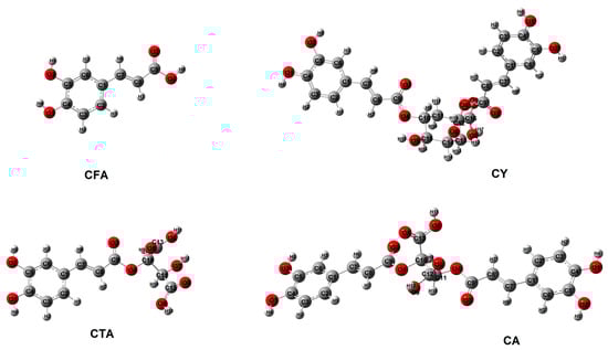 The reactivity of chemical compounds was also assessed on the basis of the calculated values of electron charges using the NBO method, and maps of electrostatic potential distribution. Table 2 shows the calculated values of the electron charges using the NBO and CHelp methods. Figure 5 shows the maps of the molecular electrostatic potential distribution (EPS). The electrostatic potential map shows the areas of a molecule related to its electrophilic (red) and nucleophilic (blue) reactivity (Figure 5). In CFA, it was observed that the oxygen atom of the carbonyl group was susceptible to electrophilic attack, while the areas of the molecule around the hydrogen atoms in the hydroxyl groups are characterized by increased susceptibility to nucleophilic attack. In the case of CTA and CA, additional centers susceptible to nucleophilic attack appear. These are the hydroxyl groups of the aromatic ring and the hydroxyl groups of a part of the molecule found in tartaric acid. The hydroxyl groups of CTA and CA are more susceptible to nucleophilic attack than in CFA. Fragments of caffeic acid included in the CY molecules show a similar distribution of electrophilic and nucleophilic susceptibility as in other molecules of the tested compounds. The hydroxyl groups of quinic acid present in the CY molecule show low nucleophilic activity.