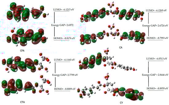 HOMO and LUMO molecular orbitals of CFA, CA, CTA, and CY.