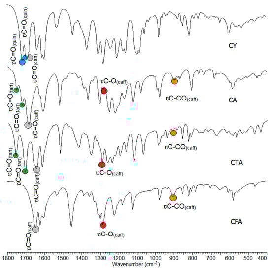 The wavenumbers, intensities, and assignments of the selected bands occurring in the FT-IR (recorded in a KBr pellet, and using the ATR technique), the Raman spectra of the tested compounds, and the theoretical infrared vibrational frequencies are presented in Table 3. The FT-IR spectra of CFA, CA, CTA, and CY are presented in Figure 6. In the spectra of the studied compounds, there are characteristic bands derived from vibration bands of the caffeic, tartaric, and quinic acid carboxyl groups. The CFA spectra show characteristic bands assigned to the stretching vibrations of the carbonyl group ν(C=O) located at 1644 cm−1 (IR), and 1640 cm−1 (Raman). In the spectra of conjugates of CFA with tartaric acid, i.e., in CTA and CA, these bands are shifted toward higher values, i.e., up to 1647 cm−1 and 1682 cm−1 in the IR spectra, and 1648 cm−1, 1681 cm−1 in the Raman spectra. In the CY (caffeic acid and quinic acid conjugate) spectra, the wavenumbers of stretching ν(C=O) occurs at 1637 cm−1 (IR) and at 1638 cm−1 (Raman). In the CTA spectra, the bands assigned to the stretching vibrations of the tartaric acid carbonyl group are located at 1758 cm−1, 1707 cm−1 (IR), and at 1757 cm−1, 1706 cm−1 (Raman). These bands are slightly shifted to the values of 1748 cm−1, 1718 cm−1 in the IR spectrum of CA. CY is a conjugate of tartaric acid and quinic acid. Characteristic bands of stretching vibrations of the carbonyl group of quinic acid are observed in the CY spectra. They are located at 1716 cm−1, 1692 cm−1 in the IR spectra, and at 1715 cm−1, 1698 cm−1 in the Raman spectra. The bands resulting from stretching vibrations of C-OH bonds of the carboxyl group of CFA are observed in the spectra of all tested compounds.