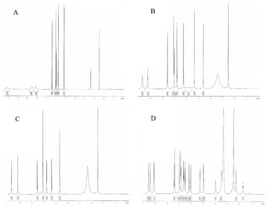 NMR spectra of (A) caffeic acid, (B) caftaric acid, (C) cichoric acid, and (D) cynarin.